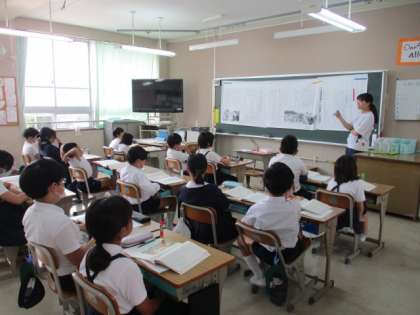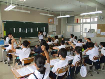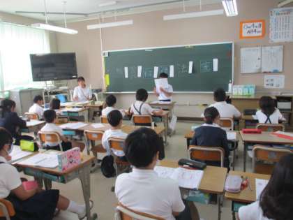 一つの花の学習をしたあとで、新出漢字の学習をしていました。新出漢字の学習では、今日の当番の子が順番に前にでて漢字の説明をしていました。その後みんなで1、2、と声をかけながら指で字を書いていましたよ。