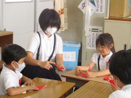 6年生が1年生の横について、1つ1つゆっくりと折り方を教えてくれていました。