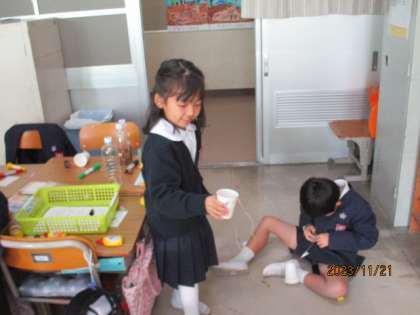 生活科です。この間集めたどんぐりや葉っぱで、宝珠幼稚園の子どもたちと遊ぶときに使うものを作っています。