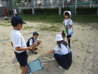 理科の授業の様子です。日向と日陰の温度をはかっています。
