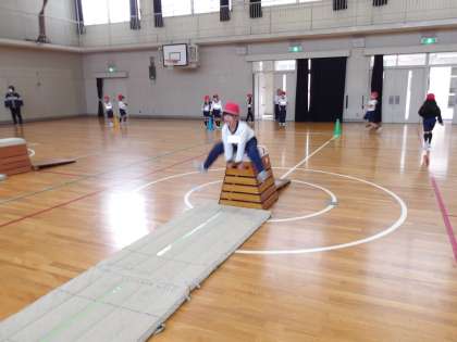 1ねん 体育 とびばこを使って 公開日 2025/01/31 更新日 2025/01/31 1年生 とびばこを使った運動遊びをしています。 動物になりきって、とびばこにまたがったり、足で強くふみきって登ったり、いろいろな動きをやってみました^^