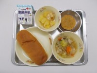 今日のメニューは、ミルクパン・牛乳・マカロニスープ・ウインナーのカレー焼きです。