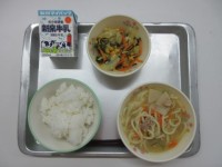 今日のメニューは、ごはん・牛乳・タッカンマリ風スープ・チャプチェです。