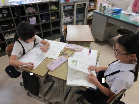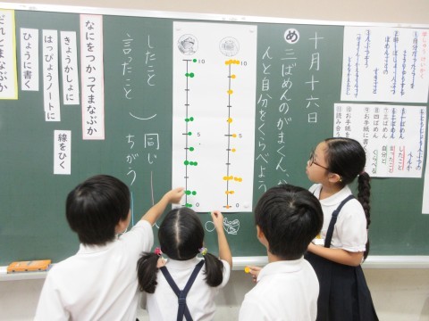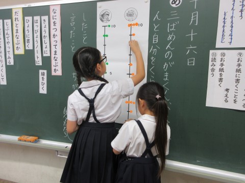 2年生 国語「お手紙」 公開日 2025/10/16 更新日 2025/10/16 2年生 国語では、「お手紙」の学習をしています。がまくん、かえるくんと自分を比べて読み、ぴったんこメーターに表しました。「自分も同じで、~だから、~すると思う」や「自分だったら、~するかな」など、赤線や青線を引きながら書き込みました。がまくんやかえるくんの気持ちに寄り添って考えていました。 +3