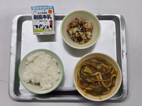 今日のメニューは、ごはん・牛乳・カレーうどん・和風サラダ・ごまドレッシングです。