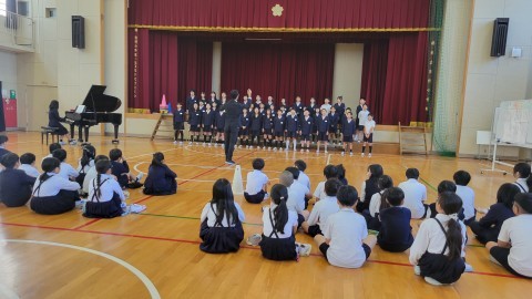 4年生 連合音楽会 鑑賞会 公開日 2025/10/27 更新日 2025/10/27 4年生 5年生は来週の連合音楽会に向けて日々練習を重ねています。 今日は、来年自分たちの番を迎える4年生に、5年生が練習してきた歌声を聞かせてくれました。 きれいで大きな歌声に4年生は胸をうたれ、5年生にとっても来週の本番に向けて貴重な発表時間となりました♫