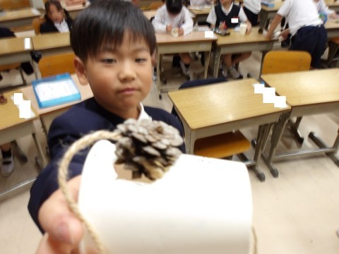 「秋をたのしもう!」をめあてに、今日はマツボックリを使ってけん玉づくりをしました^^