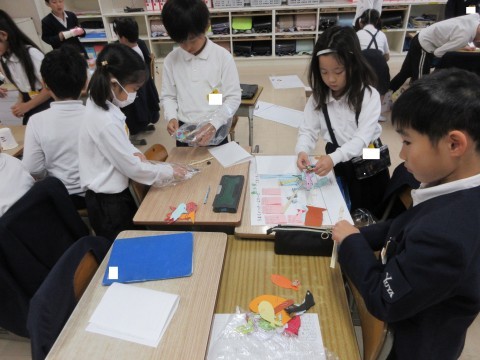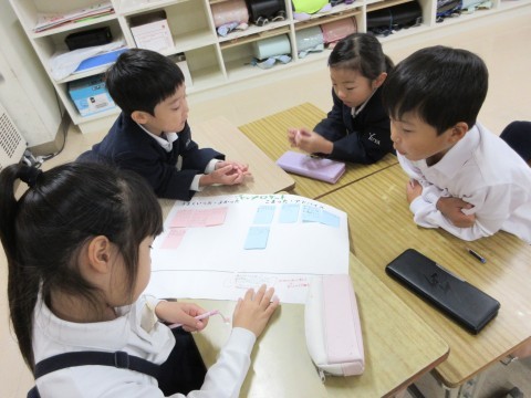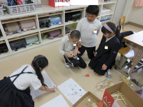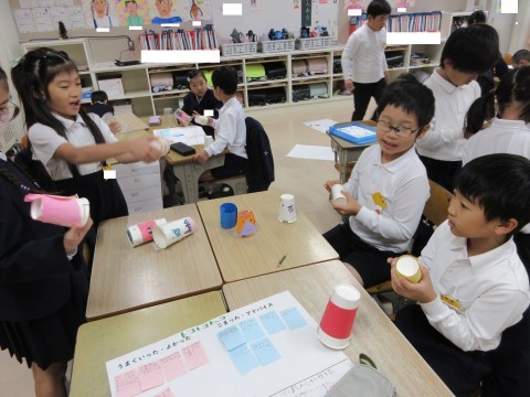 土曜参観での「あそびワールド」に向けての作戦タイムの結果から、今日は、遊び方をよりよくしたり、遊びの説明の練習をしたり、おもちゃを改良したりしました。