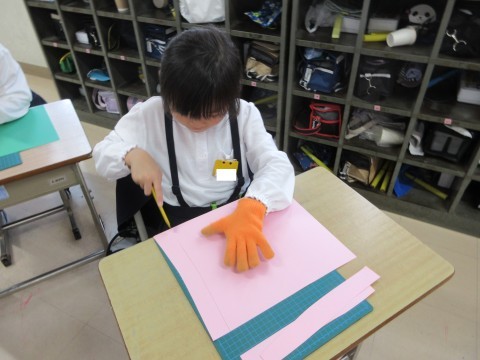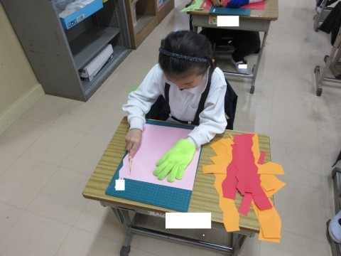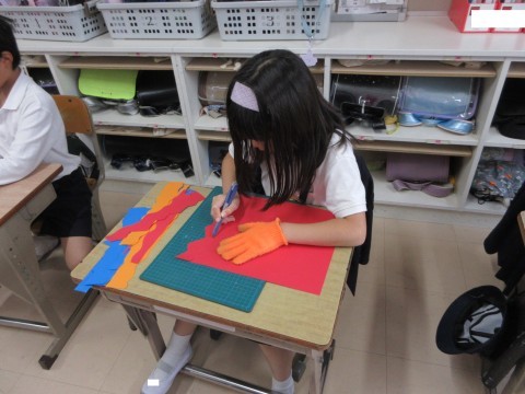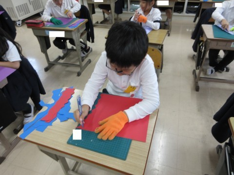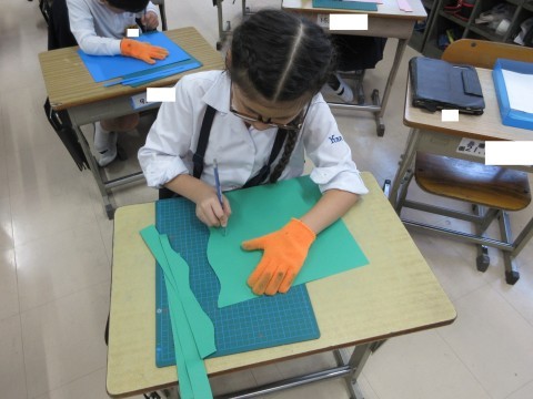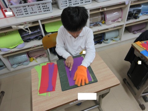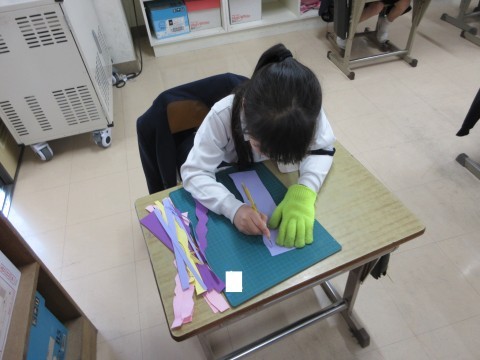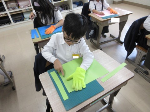 今日は、初めてカッターナイフを使って紙を切る学習をしました。