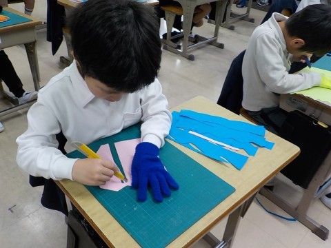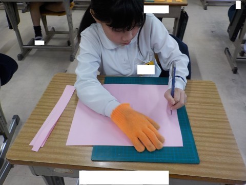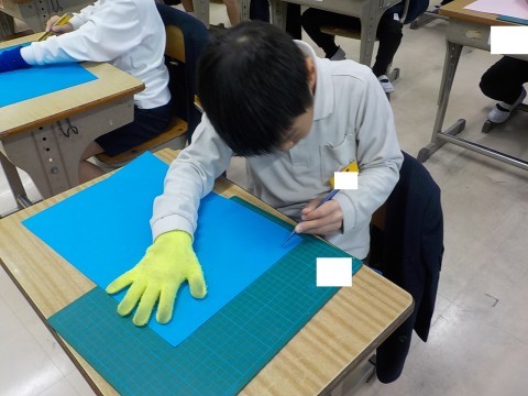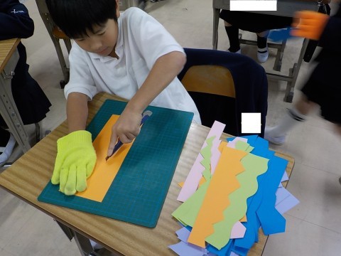 カッターナイフの使い方を確認し、まっすぐな線や波線、ギザギザ線を切ってみました♪集中して取り組む様子が見られました♪