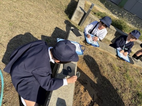 これまでは鏡を使って日光をはね返す実験をしていましたが、今日は虫めがねを使って日光をはね返す実験をしました。