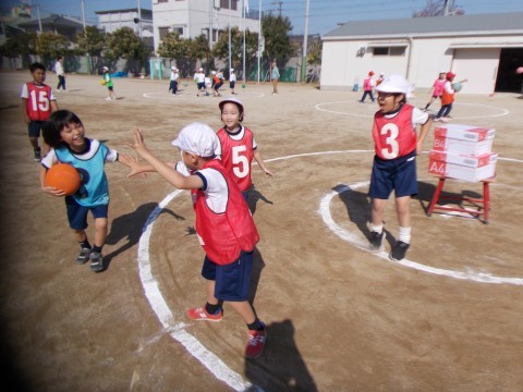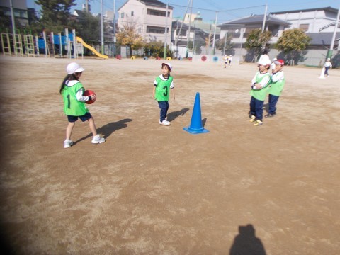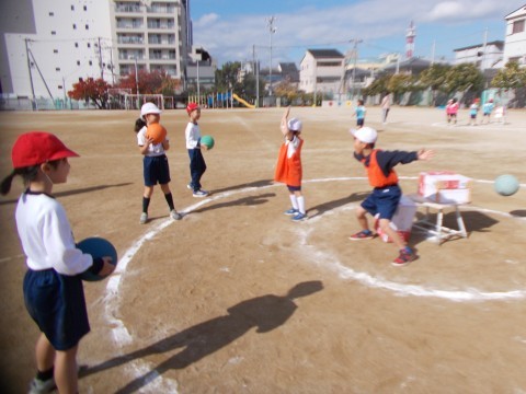 チームに分かれてまとあてゲームをしました。真ん中に置いてある,まとを目がけて力いっぱい投げていました。守りの子達は,声を掛け合いながら素早く動いて,ボールをブロックしていました。