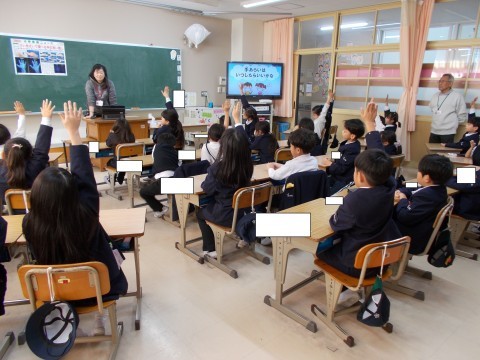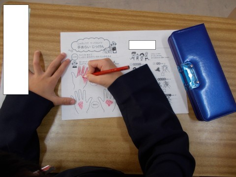 正しい手洗いについて学習しました。まず,特殊な薬品とライトを使い,普段の手洗いでどれだけ汚れが取れているかを確認しました。きれいに洗ったつもりでも,汚れが残っていて驚いていました。最後に手洗いの歌に合わせて,楽しく手洗いの仕方を学ぶことができました。