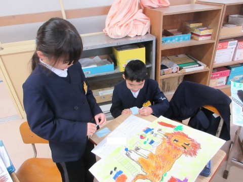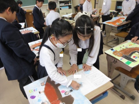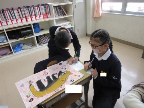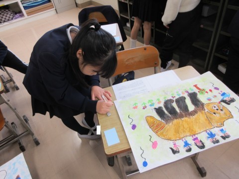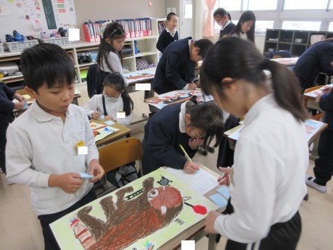 2年生 図工「どうぶつさんといっしょに」 公開日 2025/12/22 更新日 2025/12/22 2年生 かいた絵をふり返ったあと、鑑賞会をしました。「毛がふさふさした感じがよく分かっていいね!」など、友だちの作品のいいところを見つけて付せんに書いていました。 +4