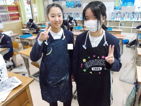 12月22日 6年 2学期も間もなく終了… 公開日 2025/12/23 更新日 2025/12/23 6年生 忙しい中,家庭科で作ったエプロンを着て「はい,チーズ♪」色んな事を頑張りましたね! 6年生