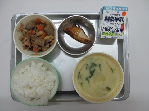 今日のメニューは、ごはん・牛乳・関西風雑煮・ぶりの照り焼き・煮しめです。