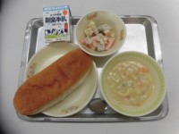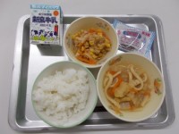 今日のメニューは、ごはん・牛乳・おでん・野菜のごまず・ふりかけです。