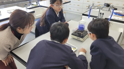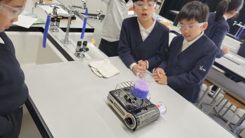 4年生 理科 公開日 2026/01/27 更新日 2026/01/27 4年生 「もののあたたまりかた」の学習で、今日は水のあたたまり方について実験を行いました。青いインクの液体が、温度があがることでピンク色に変わります。それぞれのグループが、実験結果に釘付けでした☆