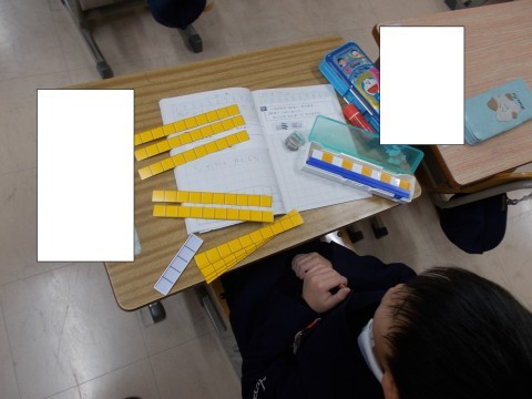 「100までのかずのけいさん」を学習しています。(何十)+(何十)の計算の仕方を考えました。ブロックを使ったり,絵に描いたりして,思い思いの方法で考え方を表していました。
