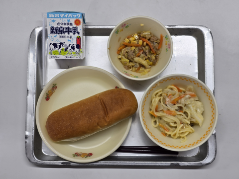 今日のメニューは、ミニコッペパン・牛乳・クリームスパゲティ・ホットサラダです。