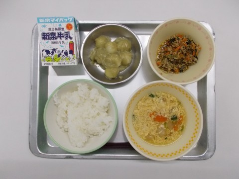 今日のメニューは、ごはん・牛乳・むらくもじる・クルミ餅・かむかむ堺っ子どんです。