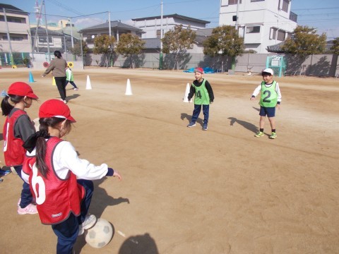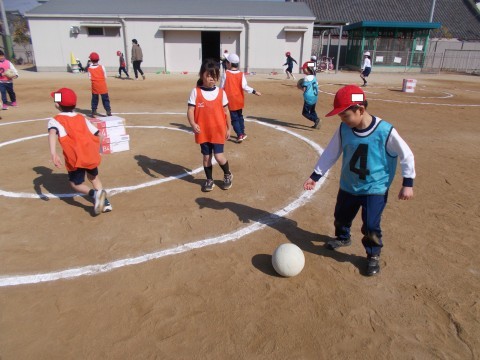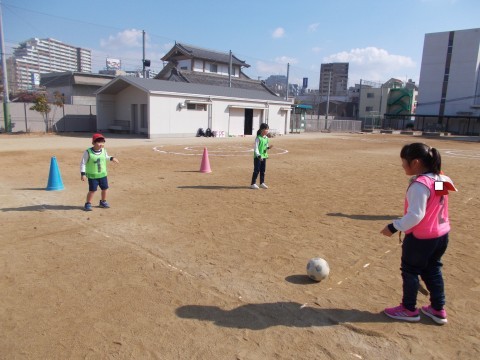 ボール蹴りゲームをしました。狙った的をめがけて,力いっぱいボールを蹴ることができました。