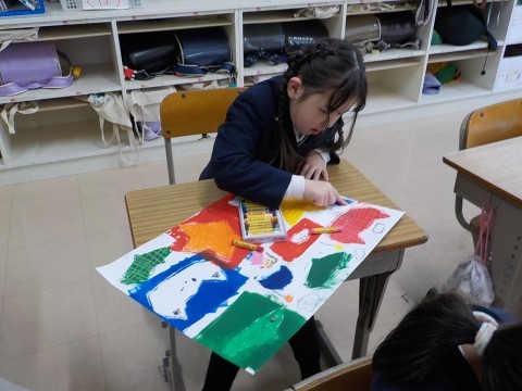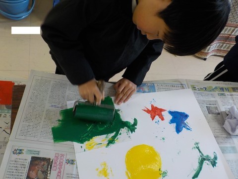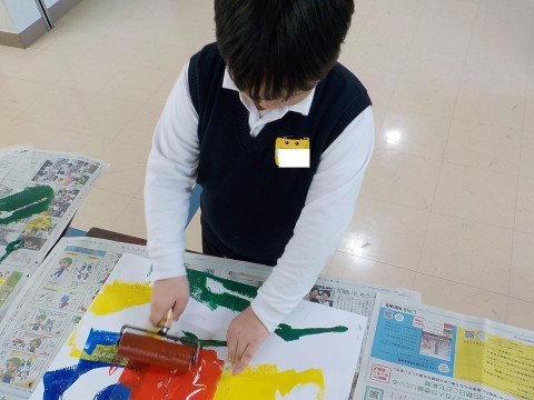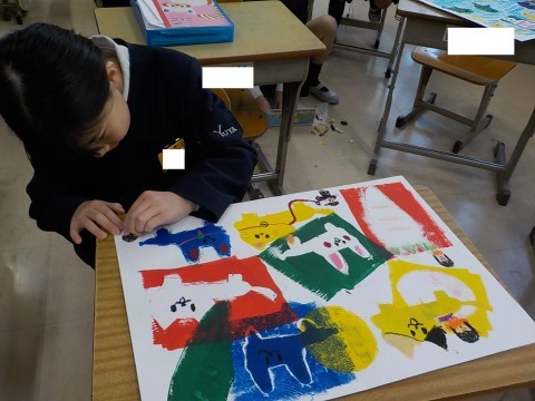 「たくさんうつそう わたしの形」の学習をしました♪自分で作った形を、ローラーにインクをつけてうつしました。最後は、クレパスを使い楽しく作品を仕上げることができました♪