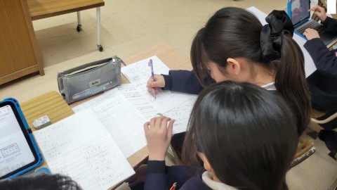 総合的な学習の時間には、自然災害から自分や大切な人を守るためにできることについての提案つくりをしています。