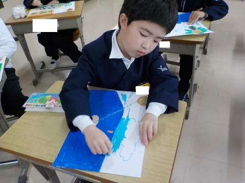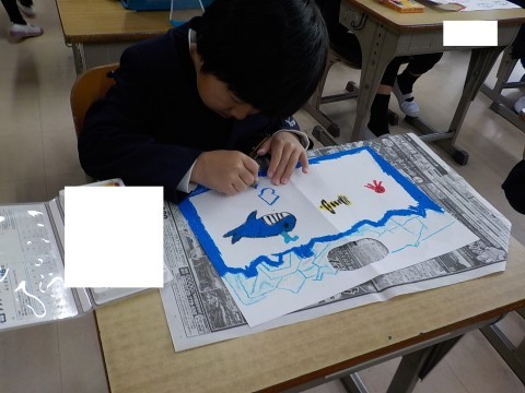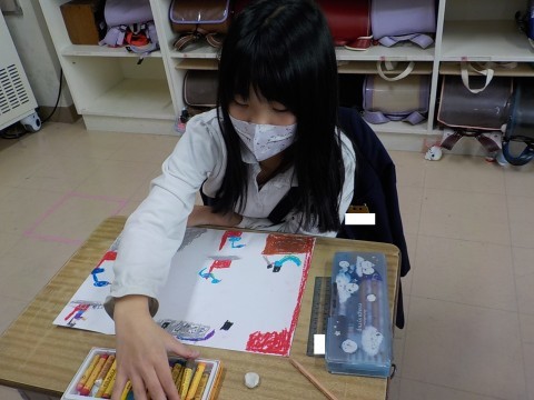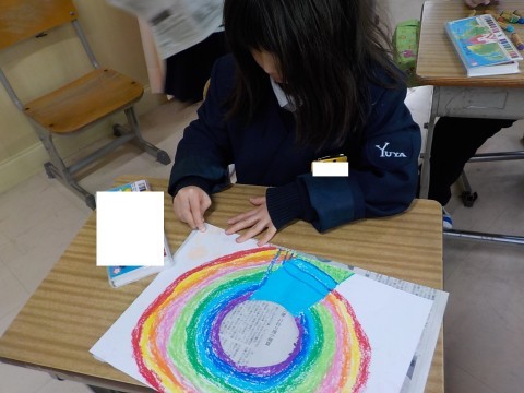 「あなでつながる ふたつのせかい」という作品を作っています。穴でつながった、画用紙の表と裏のそれぞれの世界をオリジナルマスコットが旅します♪今日は、画用紙に二つの世界を描きました。みんな楽しそうに、オリジナルの世界を表現していました。