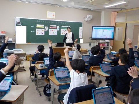 栄養教諭の先生に来ていただき、「3つのグループの食べもののはたらき」を教えてもらいました。「おもにエネルギーのもとになる」「おもに体をつくるもとになる」「体の調子を整える」3つのグループについて教えてもらい、今日の給食に出てくる食品を3つのグループに分けてみました♪どのグループの食品もすくすく育つためには必要だということも教えていただきました。バランスよく食べられるよう頑張りましょう☆