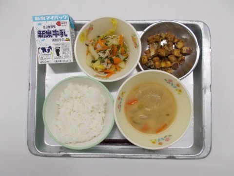 今日のメニューは、ごはん・牛乳・いなか団子汁・まめかりんとう・白菜としろなの煮びたしです。