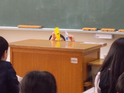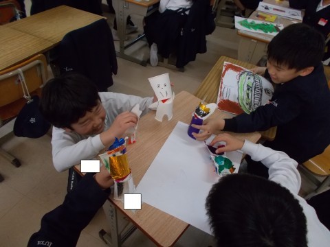 「あそぼうよ,ぱくぱくさん」でぱくぱくできる仕組みをつかった人形を作りました。背景の前で口をパクパクさせながら会話を楽しんでいました。