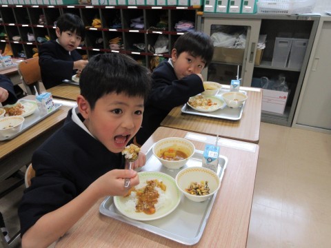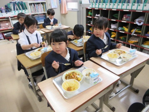 初めての給食のメニューはカレーでした。お盆に一つ一つ,スプーンや牛乳,おかずをのせていきました。用意も片づけも1つ1つがんばりました。明日のメニューも楽しみですね。