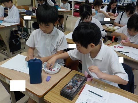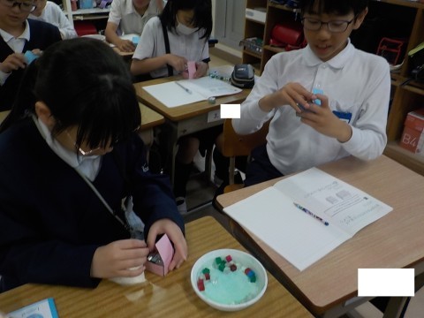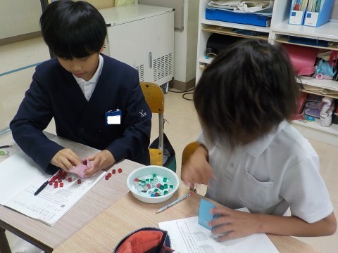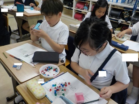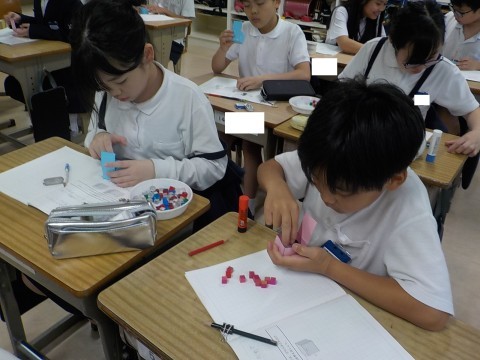 5年生 算数「直方体と立方体の体積」 公開日 2026/04/23 更新日 2026/04/23 5年生 直方体と立方体のかさの比べ方を考えました。1辺が1cmの立方体が何個入るかで比べるといいのではということになり、実際に1辺が1cmの立方体を箱に入れてみて確かめました。楽しく活動しながら、比べることができました。 +2