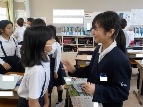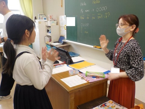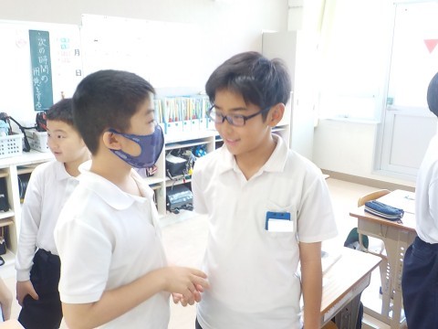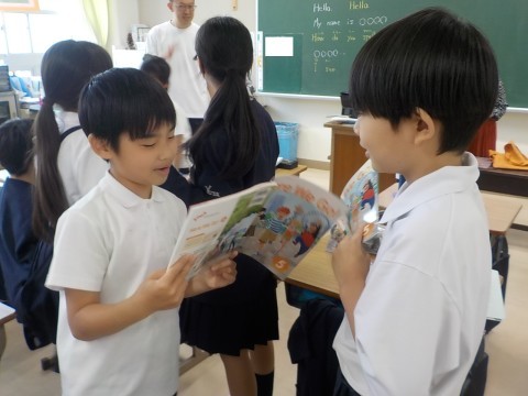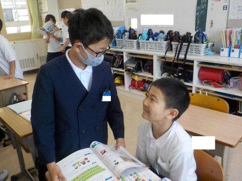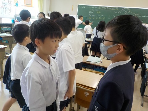 外国語では、ペアになって、お互いの名前の綴りを尋ね合ったり、好きな色や食べ物を尋ね合ったりしました。