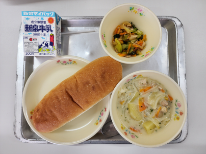 今日のメニューは、コッペパン・牛乳・クリームスープ・野菜のソテーです。