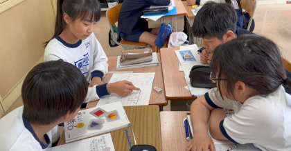 身近な形から、対称性を見つけ、自分たちで様々な発見をしながら、考えを伝えあっています。