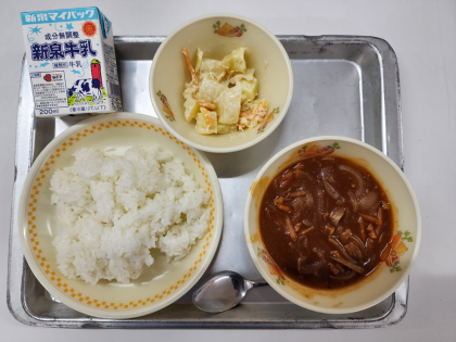 今日のメニューは、ごはん・ハヤシライス・ポテトサラダ・牛乳です。