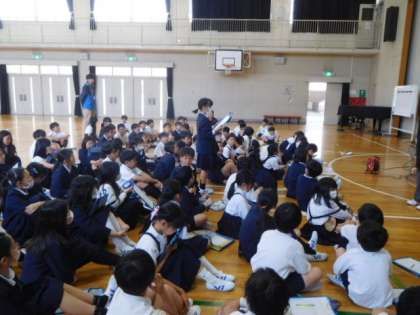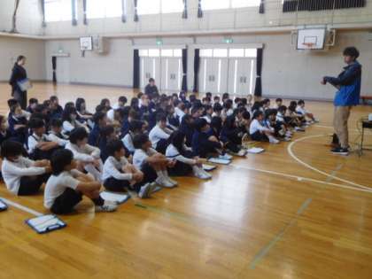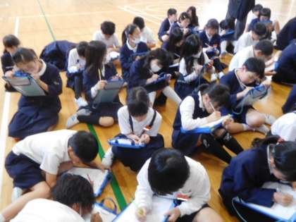 その前に、3年生と一緒に体育館に集まって、体育参観で自分はどんな姿を見せたいのか、そのためにこれからの練習でどんなことをがんばりたいのかを書いて、交流しました。