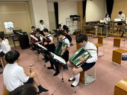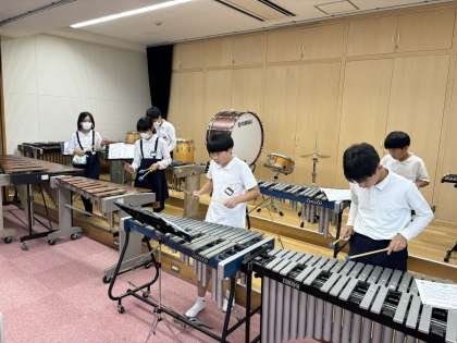ラバースコンチェルトの曲を演奏しています。先生の指揮に合わせて合奏しています。