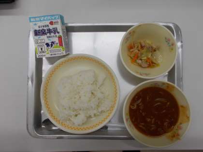 今日のメニューは、ごはん・牛乳・ハヤシライス・ベーコンサラダです。