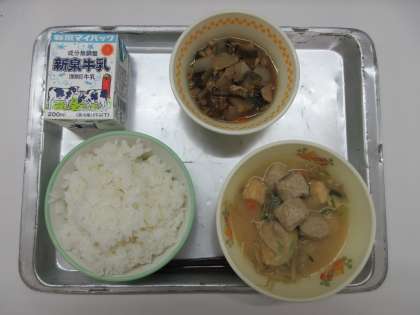 今日のメニューは、ごはん・牛乳・ちゃんこ汁・なすと豚肉の炒め煮です。