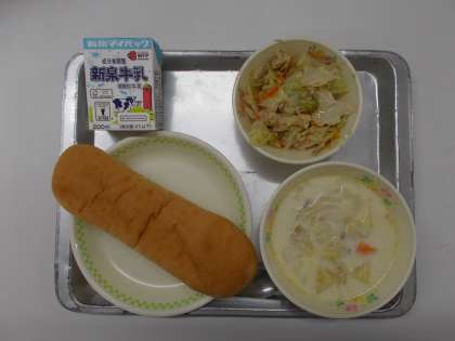 今日のメニューは、コッペパン・牛乳・ミルクスープ・ホットサラダです。