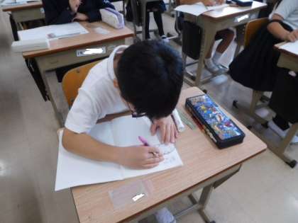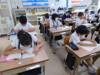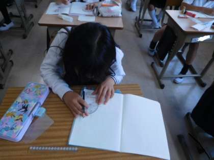 4年生 算数「角の大きさ」 公開日 2024/06/12 更新日 2024/06/12 4年生 分度器を使って、角の大きさを測りました。 まずは、90°より小さくなりそうと予想を立てました。 角の頂点に分度器の中心を合わせて、赤と黒どちらのめもりをよむのかを考えて、慎重に測っていました。 「90°より小さいはずなのに、120°になったっていうことは、反対のめもりをよんでしまっている!」という気づきもありました。