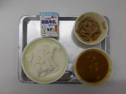 今日のメニューは、ごはん・牛乳・ポークカレーライス・ツナごぼう炒めです。