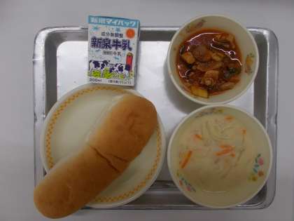 今日のメニューは、コッペパン・牛乳・コーンポタージュ・鶏肉のラタテゥイユです。