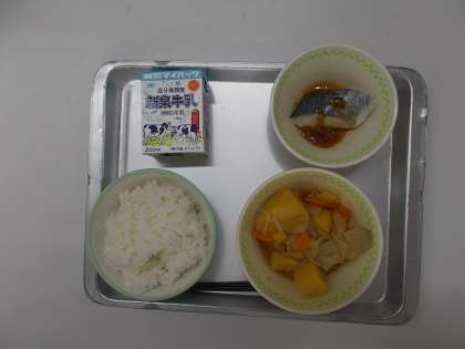 今日のメニューは、ごはん・牛乳・肉じゃが・さわらの香味ソースです。