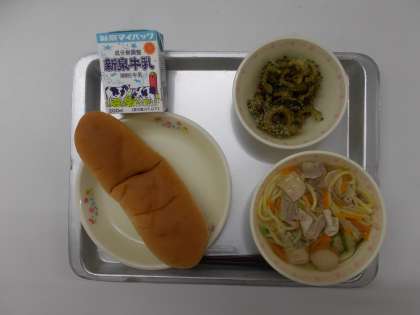 今日のメニューは、黒糖パン・牛乳・沖縄風ラーメン・ゴーヤチップスです。