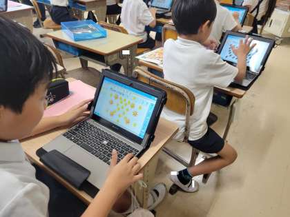 外国語の時間には、数字の1〜20を英語で発音する学習をしたり、タブレットでHow many クイズ作りをしたりしました。みんなが積極的に取り組む姿は、3年生の学年目標らしい「GREAT」な姿でした。