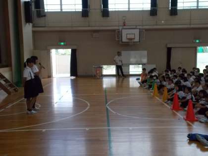久しぶりに体育館全員での全校朝礼がありました。 保健委員会のお知らせや児童会の任命式などがありました。